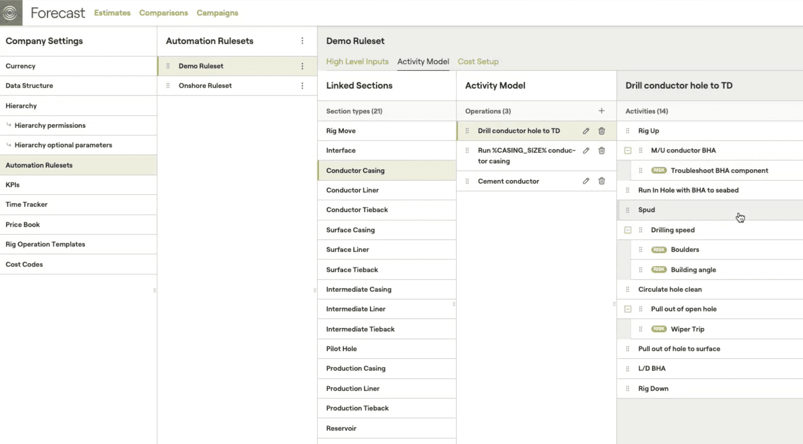 A ruleset is a predefined set of rules that specifies which operations should be carried out in the different sections of the well — and how time and cost should be calculated. Instead of having engineers build each forecast manually, users can create generic templates that: