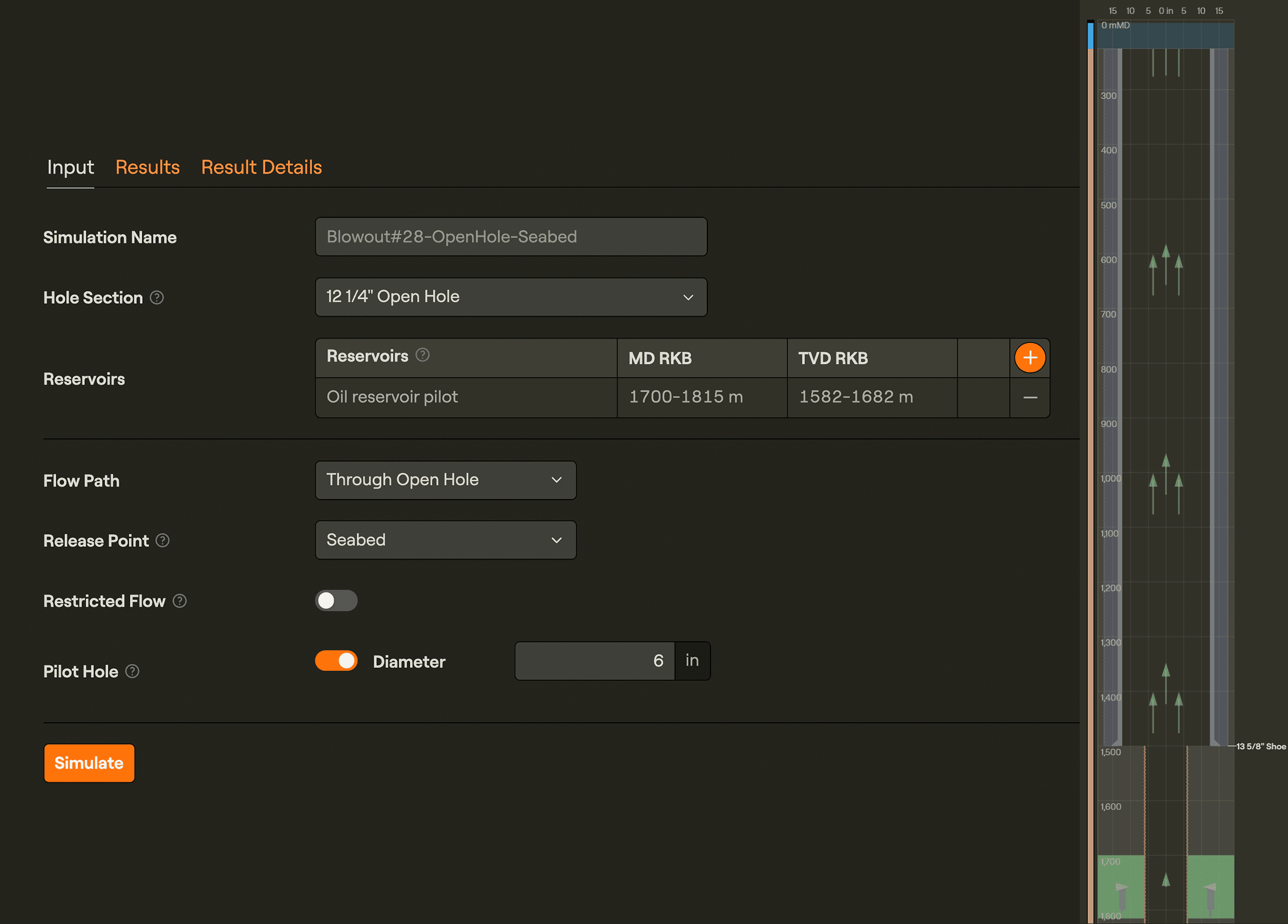 Instead of having to alter the hole sizes in the well schematic module, and thus having to create several data sets, the user can now create different blowout simulations using the new “Pilot hole” option, thereby investigating the hole size effect on the blowout rates.
